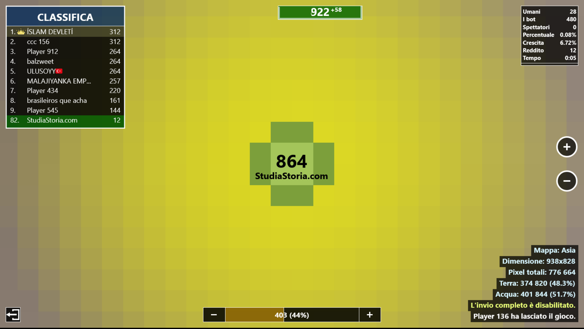 L'obiettivo all'inizio non è essere il giocatore più grande, ma quello con più truppe accumulate. Dobbiamo divorare il territorio neutro usando solo una piccola percentuale delle nostre forze.