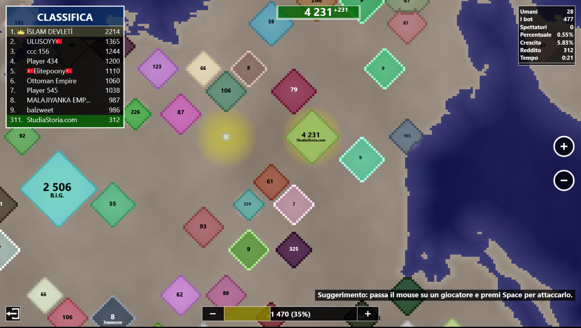 Evita l'affollamento reale: Cerca zone con molti bot (giocatori controllati dall'IA, solitamente grigi) e pochi giocatori reali. I bot sono territori facili da conquistare.